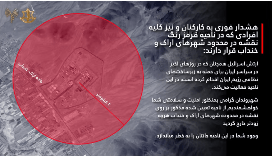 در نقشهای که ارتش اسرائیل همراه با این پیام منتشر کرد، این ناحیه در محدوده شهرهای اراک و خنداب با رنگ قرمز مشخص شده است.