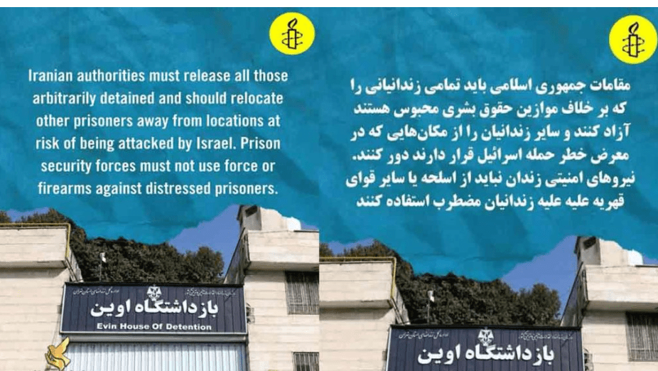 عفو بینالملل از مقامات جمهوری اسلامی خواست تمامی زندانیانی را که بر خلاف موازین حقوق بشری محبوس هستند، آزاد و سایر زندانیان را از مکانهایی که در معرض خطر حمله اسرائیل قرار دارند، دور کنند.
