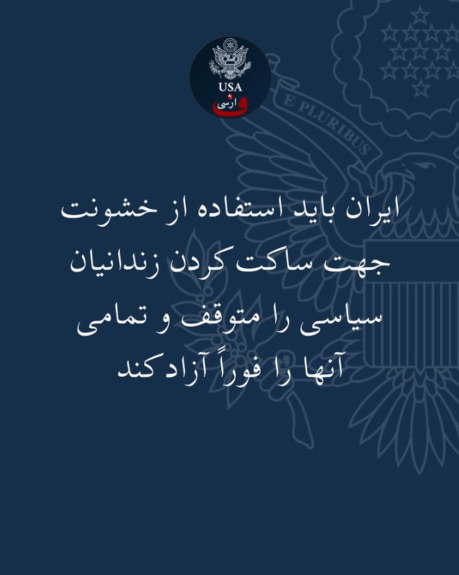 در متن کوتاهی که در حساب این دفتر در شبکه اجتماعی ایکس نوشته شده، آمده است: «رژیم ایران جان نرگس محمدی، برنده جایزه صلح نوبل، و سایر زندانیان سیاسی ایرانی را تهدید میکند. ایران باید استفاده از خشونت جهت ساکت کردن زندانیان سیاسی را متوقف و تمامی آنها را فورا آزاد کند.»
