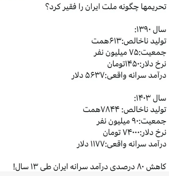 کاهش ۸۰ درصدی درآمد سرانه ایران طی ۱۳ سال!