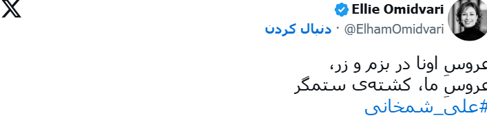 کاملیا سجادیان، مادر محمدحسن ترکمان، معترض کشتهشده در اعتراضات ۱۴۰۱ در واکنش به انتشار فیلم عروسی دختر علی شمخانی در پستی در اینستاگرام عکسهایی از عروس و دامادهای کشته شده به دست جمهوری اسلامی را منتشر کرد.