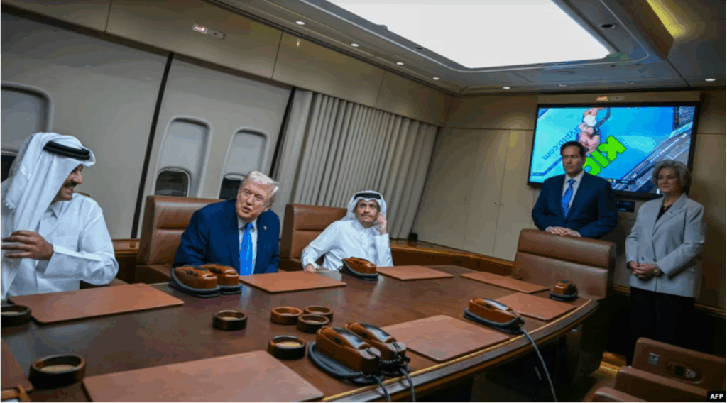 رهبران قطر که از متحدان کلیدی در حفظ توافق صلح غزه هستند، در پایگاه هوایی العدید، محل استقرار مقر منطقهای ارتش آمریکا و هزاران سرباز آمریکایی، سوار هواپیمای رئیسجمهور آمریکا شدند و با او گفتوگو کردند.