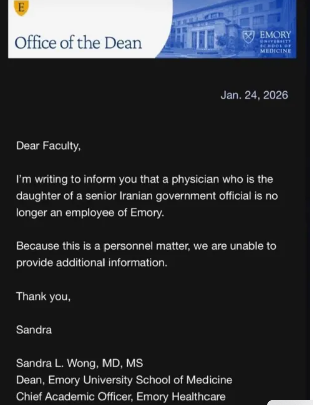در این نامه به امضای رییس دانشکده پزشکی دانشگاه اِمُری آمده: «این نامه را مینویسم تا به اطلاع شما برسانم که پزشکی که دختر یک مقام ارشد دولتی ایران است، دیگر کارمند اِمُری نیست.»